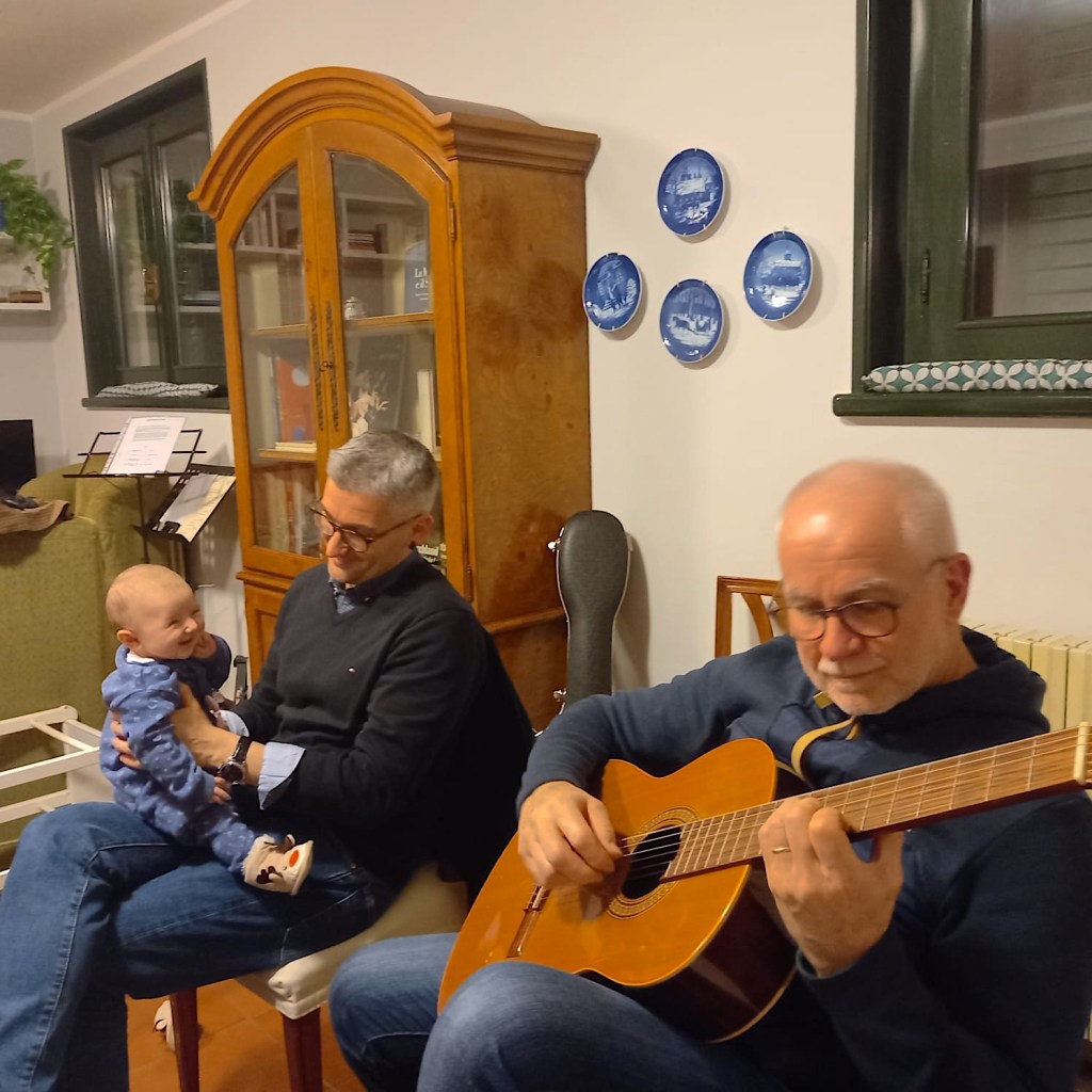 Mentre Antonio, pur non avendo mai frequentato scuole d’arte, è stato fin da giovanissimo un appassionato sperimentatore di tecniche pittoriche, Emilio ha imboccato la sua vera vocazione da “meno giovane”, entrando tre anni fa a pieno titolo nella classe di chitarra classica del conservatorio di Parma. Tantissimi sono ormai i concerti da solista o in formazione da camera che lo hanno visto con un ruolo da protagonista (e che la mamma si è dovuta immancabilmente sorbire…), così come innumerevoli sono i quadri e le stampe di Antonio che vengono esposte fieramente in sale prestigiose di tutta la Puglia e non solo (così come sulle pareti di casa nostra).